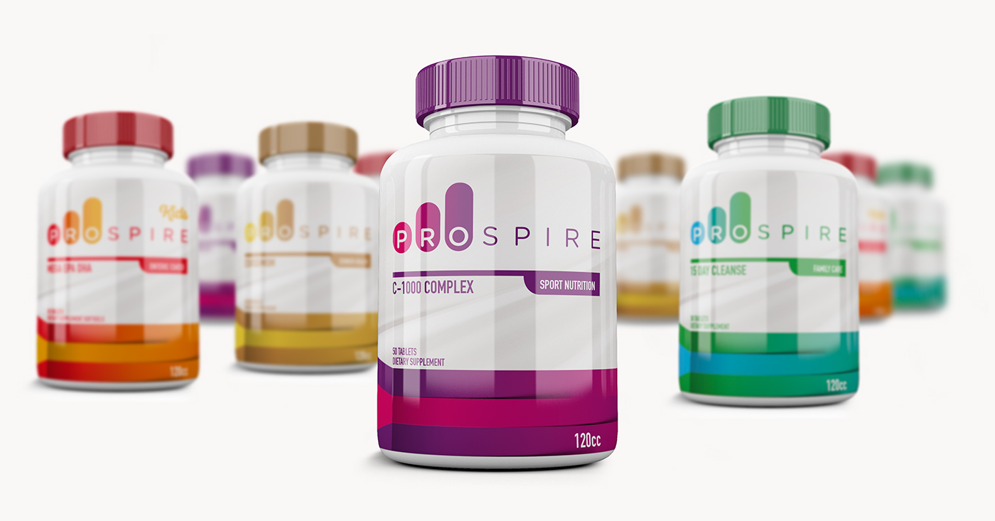 品牌logo設計與包裝設計明亮,大膽的色彩帶給我們歡樂,并鼓勵我們充實地生活。利用Prospire維他命激發(fā)消費者的生活。